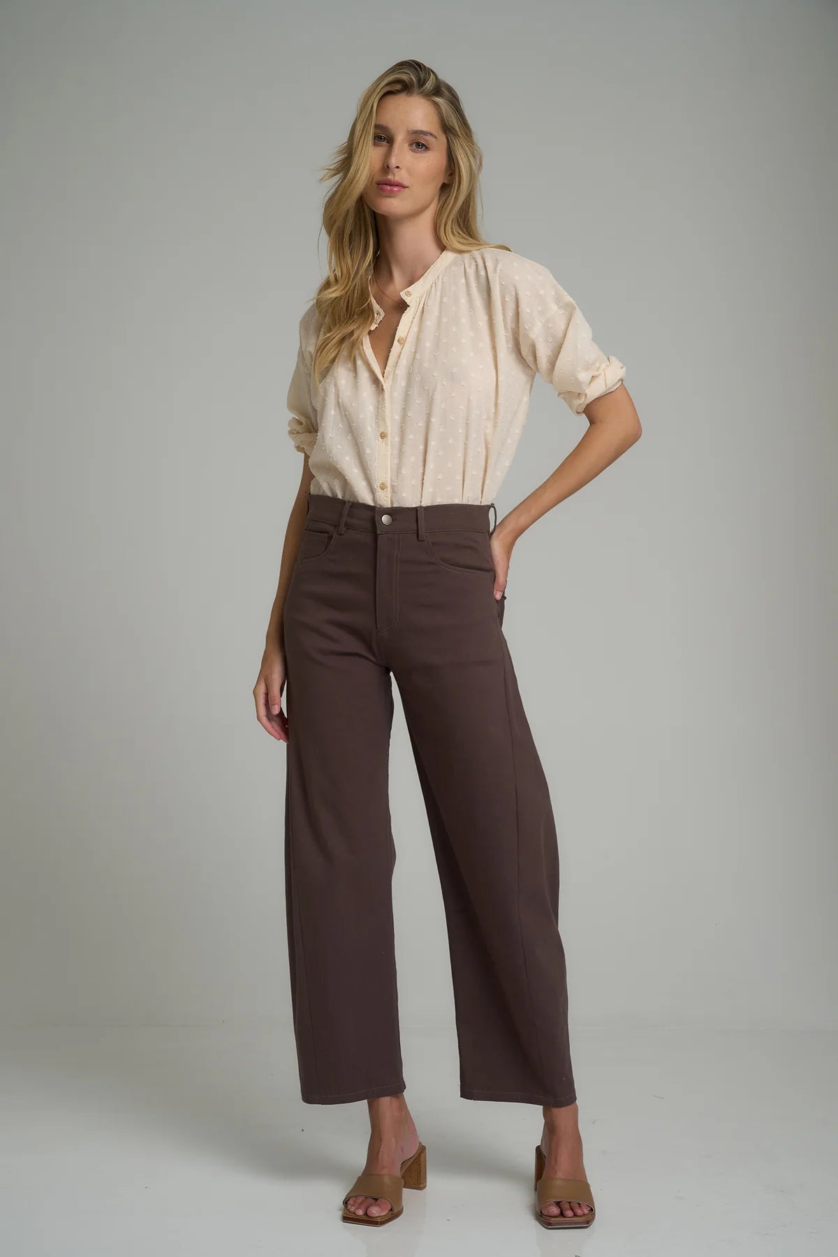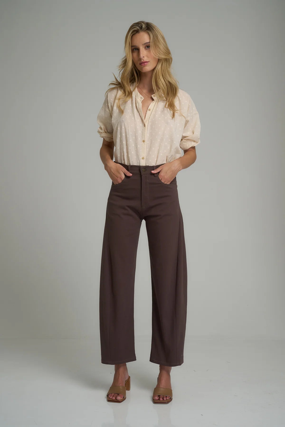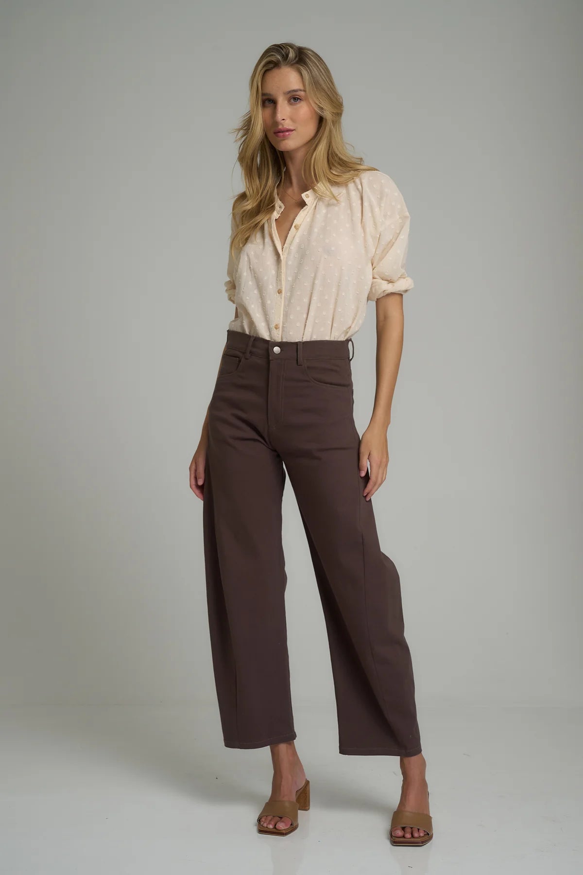 Upgrade your pant game with the Guildford Cotton Pant, a vintage inspired denim with a modern structure. Features include a high-rise waist that accentuates your figure and a slightly tapered cropped relaxed leg, these jeans bring a chic, modern twist to your look. The unique insert detailing on the outer seam creates a subtle bowed-leg silhouette, adding a touch of artistry to these dark brown pants. Crafted from a lightweight cotton stretch, the Guildford Pant are designed with comfort in mind making them perfect for casual outings or elevated styling. Pair these jeans with the Hathaway Top to take your wardrobe to the next level.