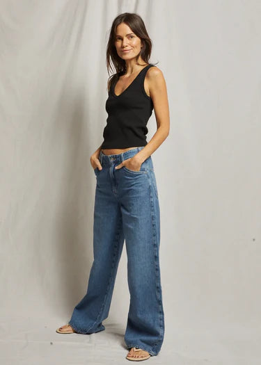 this silhouette shouldn’t be a stranger. it’s our bestselling blondie body now offered in a v neck. routinely paired with classic denim or one of our relaxed french terry bottoms, you will want to add this ribbed tank into your weekly wardrobe rotation.