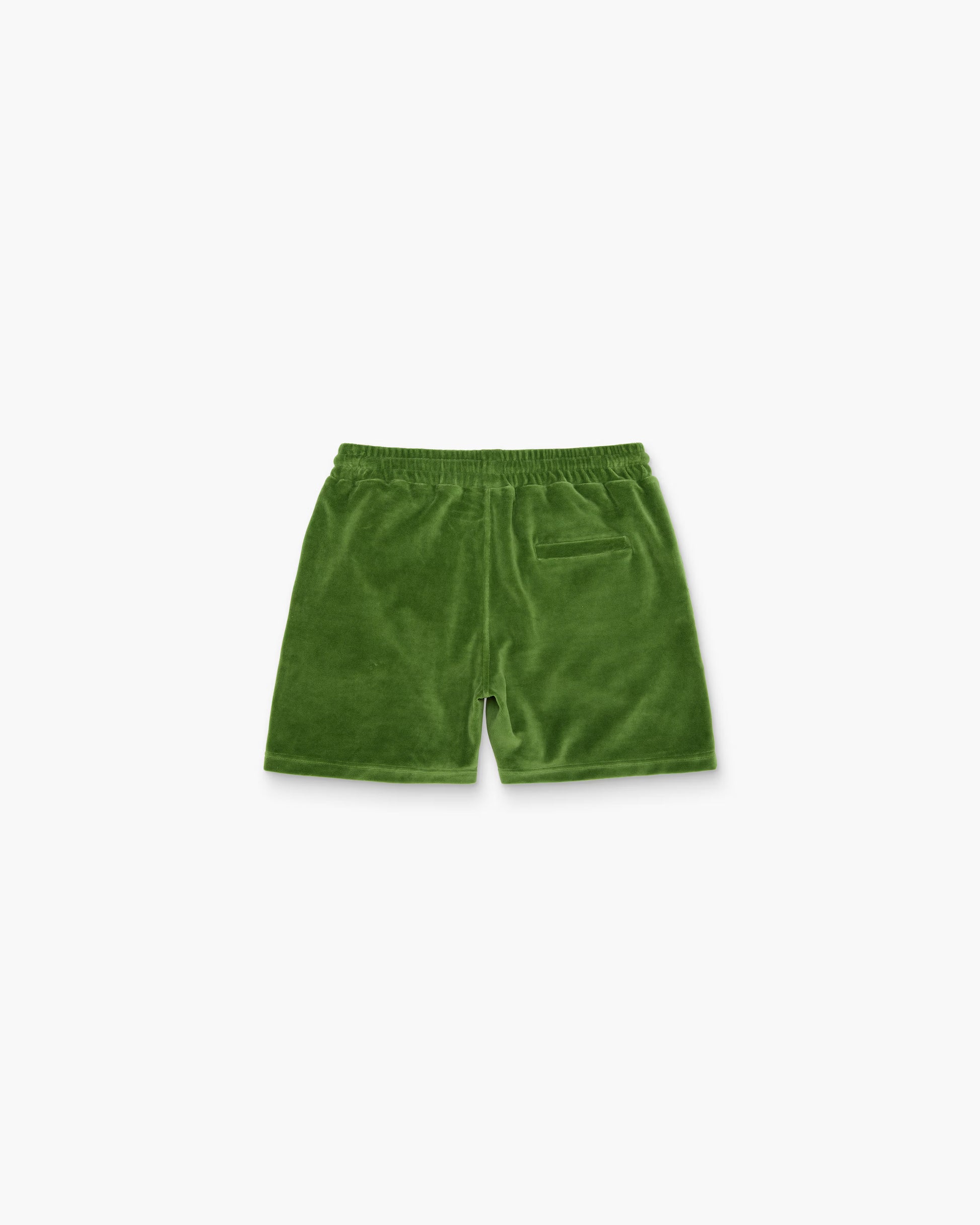 Green shorts in midweight knitted velour. Elastic waist with drawstring, two slanted side pockets and one back welt pocket. Regular fit and mid-rise.