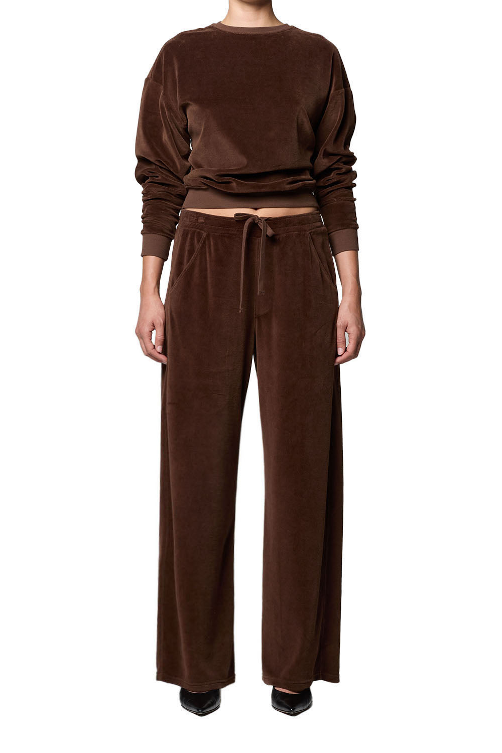 Looks Like: Dark brown velour long sleeve crewneck